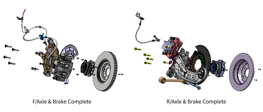 전/후륜 Suspension을 구성하는 부품으로 전/후륜 Axle과 Wheel speed sensor, Caliper, Brake hose, 각종 Arm류를 포함하는 조립 단위로 차량 하중 지지, 진동/충격 흡수, 휠 측으로 동력 전달, Wheel speed 감지, 제동 및조향 기능을 수행